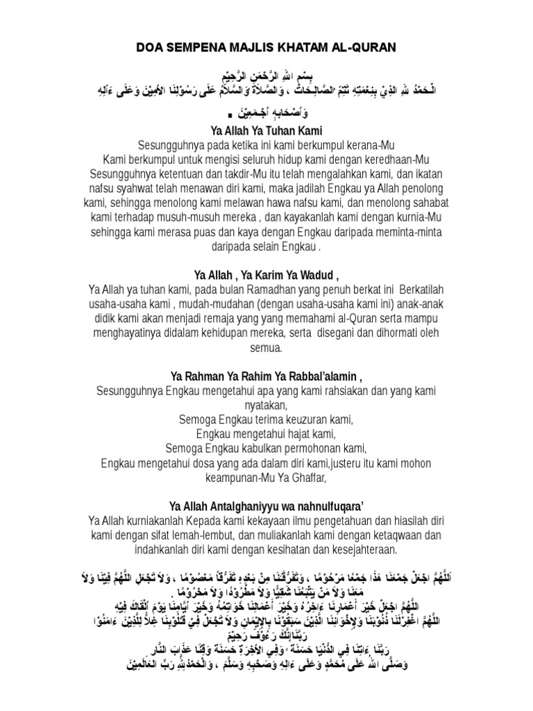 Majlis Khatam Al Quran Dan Iftar Akademi Bahasa 2017 Language Academy from humanities.utm.my Ya allah ya fattah ya alim engkau rahmatilah kami dengan kemuliaan al quran. Boleh dapatkan doa khatam quran dalam bahasa melayu, yang kami tulis semula dari tulisan jawi. Alhamdulillahhi robiil a'lamiien pada kesempatan kali ini saya masih diberi kesempatan untuk berbagi kebaikan. Doa agar diberikan keturunan yang shalih. Sudahkah anda khatamkan al quran? Dengan pembahasan secara singkat dan jelas. Majlis yang turut disiarkan secara langsung di facebook rasmi tv pertiwi itu membabitkan penyertaan hampir 4,000 wanita dari seluruh malaysia, termasuk di luar negara. Semoga selalu dalam keadaan sehat wal a'fiat.